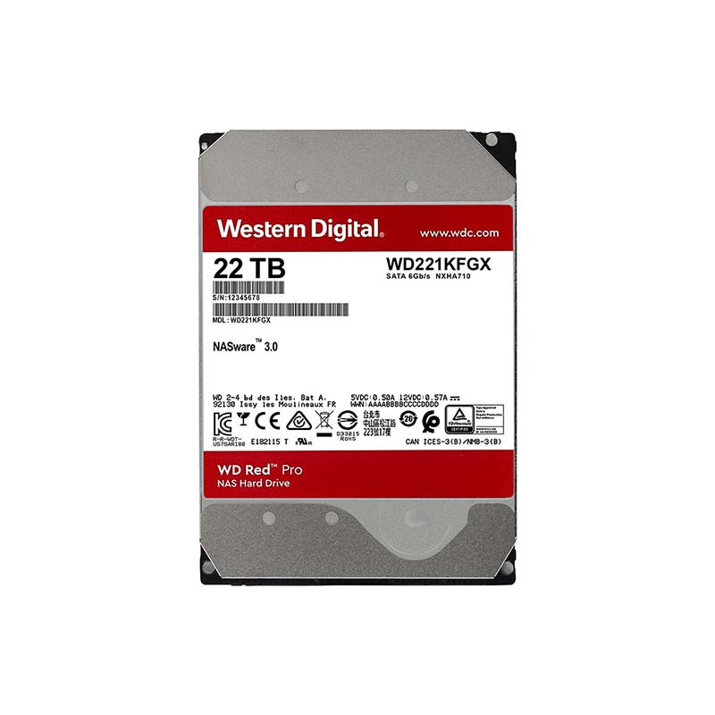 西部数据(WD)NAS机械硬盘 WD Red Pro西数红盘 22TB 7200转512MB SATA CMR垂直 NAS专用硬盘 3.5英寸 WD221KFGX